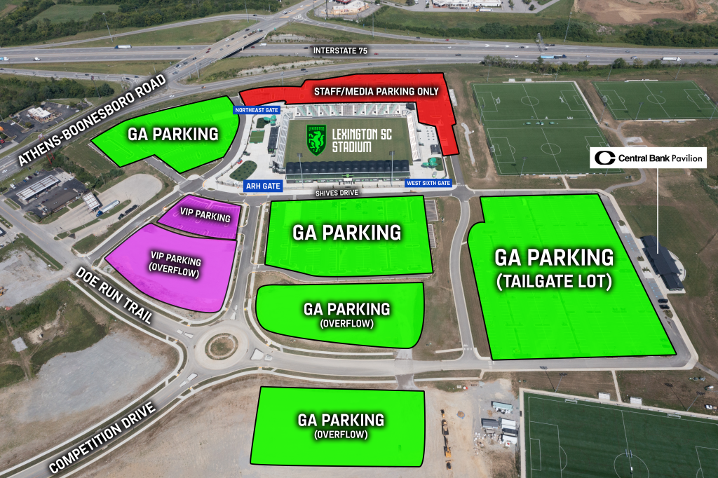 Parking at Lexington SC Stadium is FREE for all fans. Guests are welcome to park in any of the General Admission (GA) parking areas shown on the map. Parking lots may be accessed via Competition Drive or Doe Run Trail.