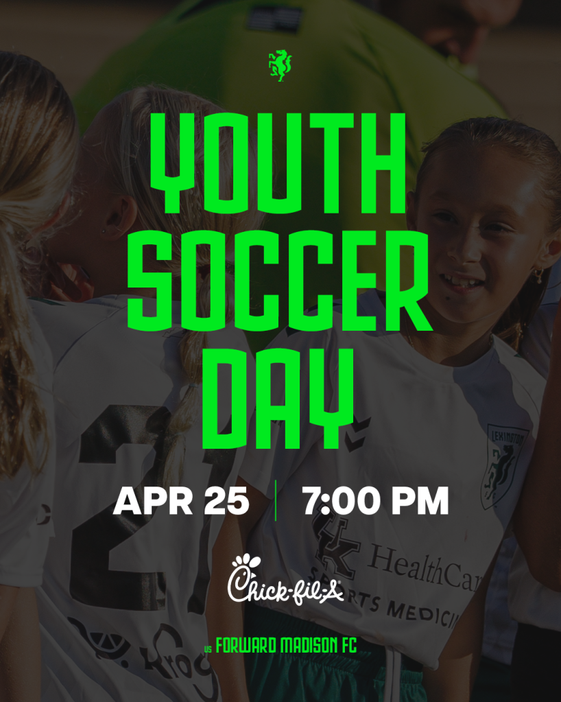Youth athletes are invited to participate in a pre-match youth clinic hosted by Lexington SC! Participants will receive access to the pre-match clinic, a t-shirt and a ticket to the match. Youth soccer players are encouraged to wear their team jerseys to the match. Purchase tickets for the pre-match clinic here.